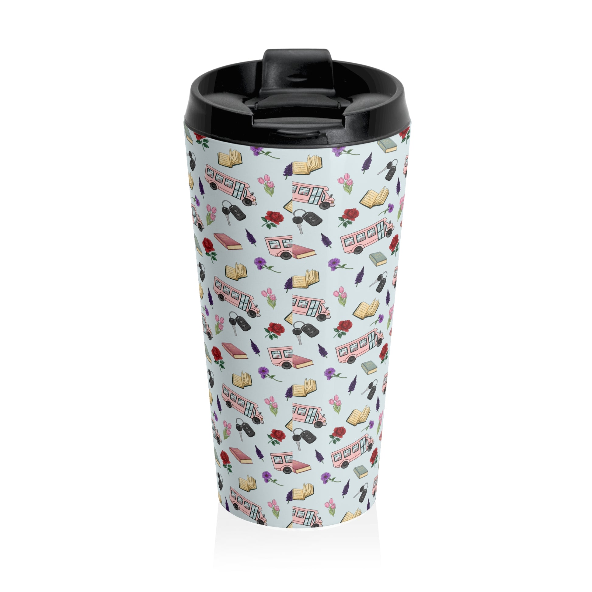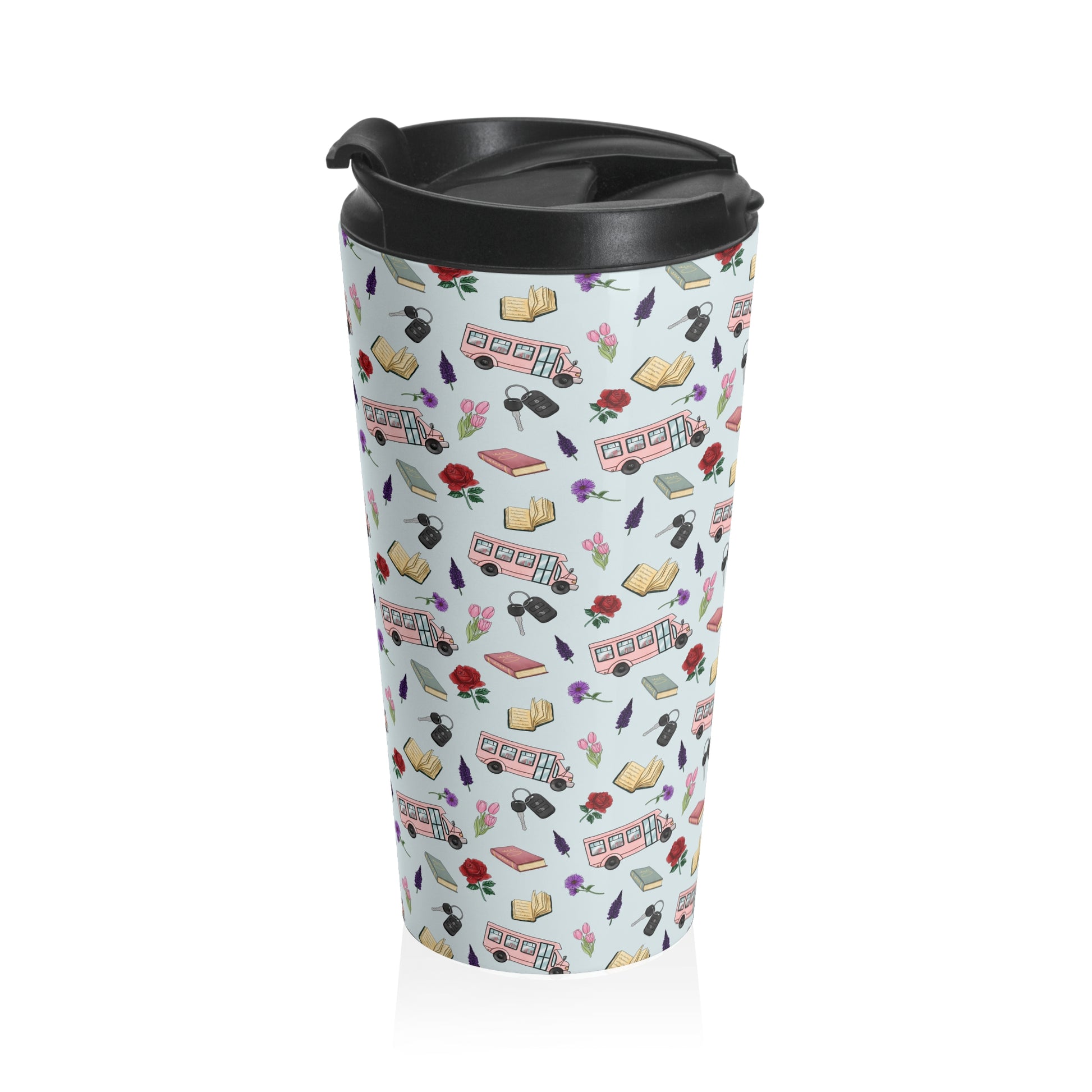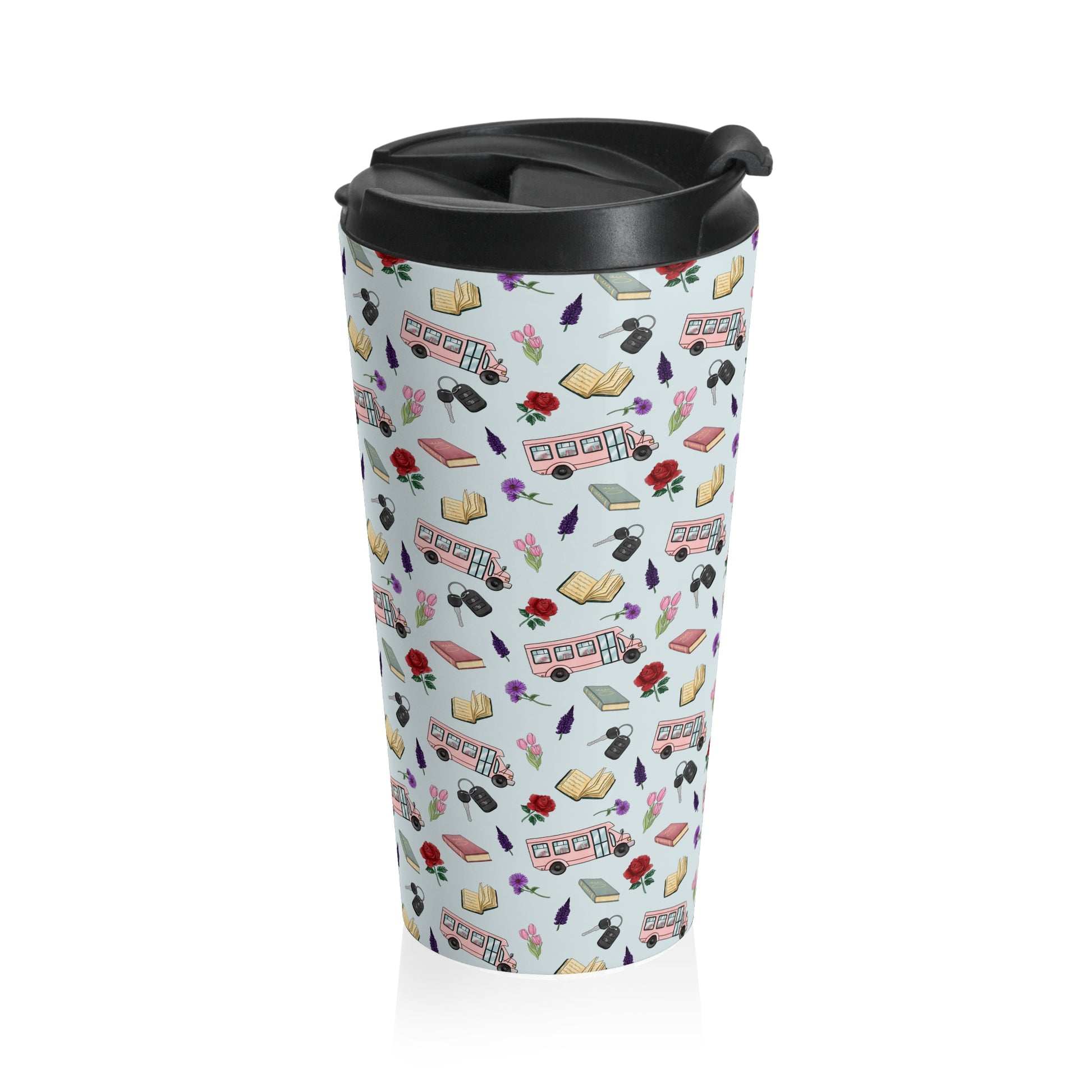 This 15oz stainless steel travel mug brings a playful, bookish spirit to every commute and study session. The light-patterned wrap features tiny buses, open books, glasses, pens, and roses—little scenes that nod to city students, teachers, and bibliophiles who move between classes, cafés, and libraries. Its vacuum-insulated steel body keeps drinks at the right temperature while the secure screw-on lid with a flip-top helps keep spills away during on-the-go mornings. Rounded edges make it comfortable to hold and the compact 15oz size fits most cup holders, so it slips easily into backpacks and bike cages. Hand it to someone who loves slow-sipped coffee between chapters, or bring it along to early morning lectures and late-night study marathons.